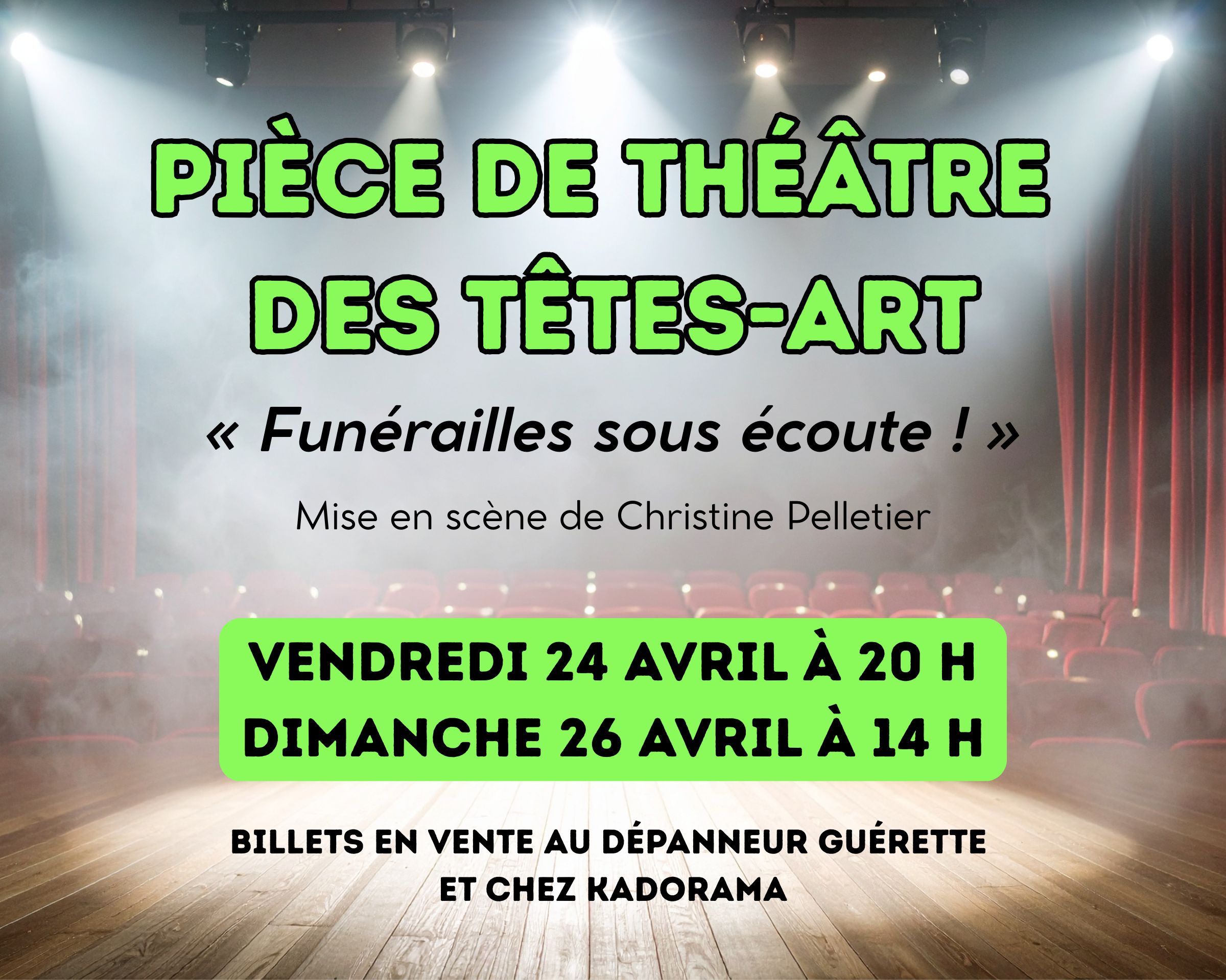 Les billets au coût de 15 $ sont disponibles chez Kadorama, au dépanneur Guérette, au bureau du CAPAB et auprès des comédiens et comédiennes.